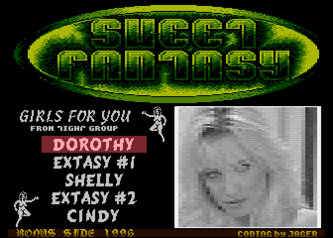 Typowy sex slideshow. Pomysł oraz kod Jager. Demko składa się z dwóch części - pierwsza to slideshow (obrazki w formacie HIP - pełnoekranowe), w drugiej części umieściłem animacje w HIP'ie (była to, albo i nadal jest, jedyna produkcja, w której można było to zobaczyć). Aby uruchomić demo potrzebne jest Atari z minimum 64kB dodatkowej pamięci (a najlepiej mieć 256kB - wtedy zobaczysz animacje). Niestety, do kodu wkradł się błąd i program rozpoznaje tylko rozszerzenie pamięci w standarcie TOMS (chyba najpopularniejsze w Polsce).