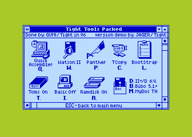 Demonstracja możliwości pakietu jaki instalował Gumi w Atari. A co to jest? Oto fragment opisu... "TTP jest to zbiór programów, których większość z nas używa bardzo często (o ile nie zawsze). Jest on stale pod ręką (odpada szukanie dysków), dostęp do danego programu jest dużo szybszy niż odczyt z dysku (nie liczę tego szukania dysku). Krótko mówiąc, naciskasz czerwony guziczek i... jest!". Wiecej na ten temat można przeczytać w samym demie lub Serious Magazine (niestety, teraz nie pamiętam numeru wydania), gdzie znajdziesz opis instalacji tego pakietu.