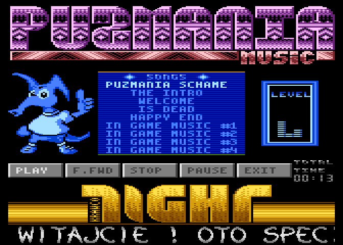 Dodatkowo na dysku znajdziesz Puzmania Music Player. Znajdują się w nim wszystkie muzyczki, które można usłyszeć w pełnej wersji gry. Pewnie większość z Was nie uwierzy, ale to demko napisane zostało w BASIC'u :) Chyba był to mój ostatni program napisany w tym języku. Demko to zostało umieszczone na drugiej stronie dysku z Puzmanią wydanej przez L.K. Firebird.