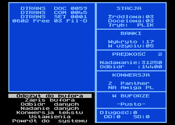 Program umożliwia transmisje danych przy pomocy interfejsu RS-232. Wiecej informacji na ten temat znajdziesz w Serious Magazine #6. Zamieszczam tutaj 2 wersje gdyż różnią się one sposobem przesyłania danych w trybie DYSK. Wersja 0.7 stosuje swój własny format, natomiast wersja 0.9 ma już pełną obsługę ATR'ów. Oprócz tego wersja 0.9 ma wprowadzone szereg zmian i usprawnień (np. można przeglądać pliki graficzne bezpośrednio po odebraniu ich z komputera po drugiej stronie kabelka).