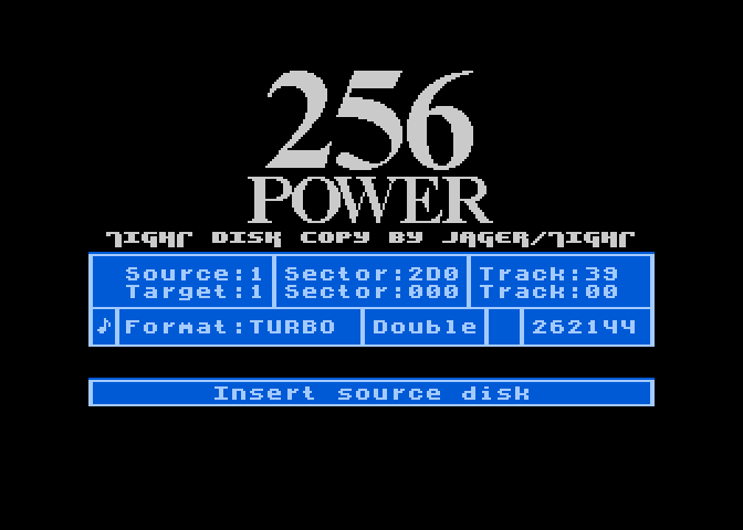 Kopier dysków. Program wymaga minimum 192kB dodatkowej pamięci (łącznie Atari powinno mieć 256kB). Był to mój pierwszy kopier, a więc proszę o wyrozumiałość :) Docelowo miał on się znaleźć w pack'u Power 256. Niestety, ten pack nigdy nie powstał :( Program rozpoznaje prawidłowo max. 256kB dodatkowej pamięci, wykorzystuje z tego max. 190kB. Piszę o tym na wypadek gdyby ktoś miał np. 1MB, a tu nagle kopier pokazał 256kB :)