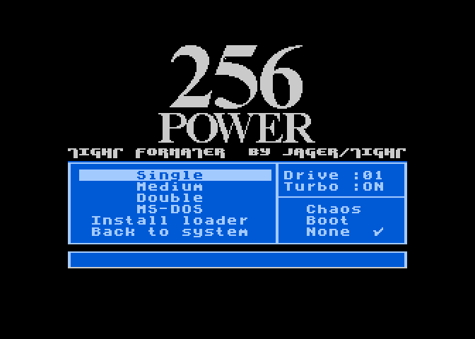 Formater dysku. Program potrafi sformatować także uszkodzone dyski. Obsługuje gęstość pojedyńczą, rozszerzoną (DOS 2.5 lub DOS II+/D), podwójną oraz MS-DOS (jednostronnie - 180kB). Umożliwia także zainstalowanie po sformatowaniu dysku Chaos Loadera lub Boot Loadera. Podobnie jak Tight Disk Copy docelowo miał on się znaleźć w pack'u Power 256. Niestety, ten pack nigdy nie powstał :(