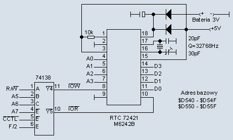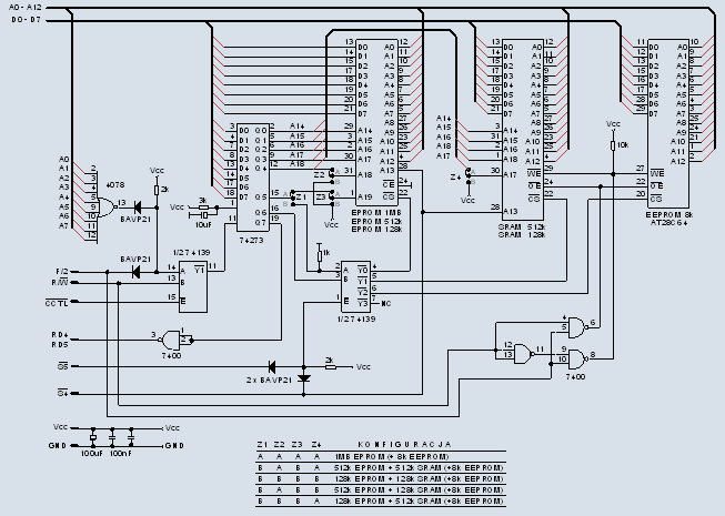 Opornik na wejściu dekodera symuluje działanie bitu D5 dla konfiguracji 1MB EPROM (opcjonalnie +8kB EEPROM). Klasyczny układ bramek NAND generuje sygnał wpisu i odczytu dla pamięci RAM i EEPROM.